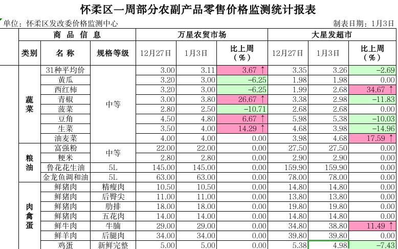 北京市怀柔区发改委本周市场监测情况(12月27日--1月3日)