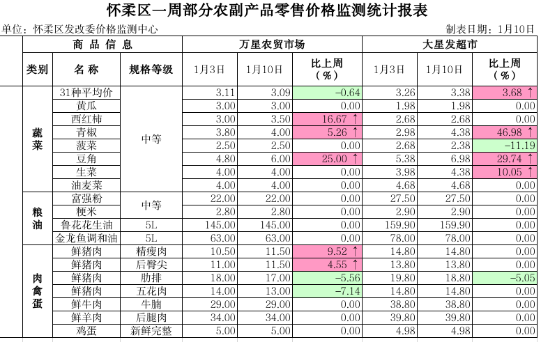 本周(1月3日--1月10日),根据怀柔区发展和改革委员会价格监测数据显示:我区3家农贸市场、4家超市货源供应充足,价格下跌。