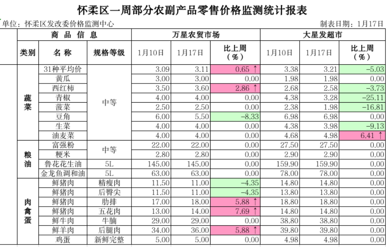 怀柔区发改委本周市场监测情况(1.10--1.17)