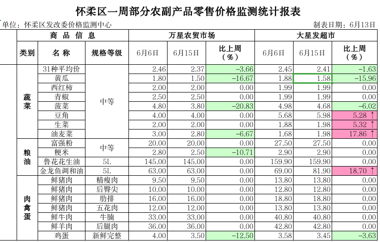 本周(6月6日--6月13日),根据怀柔区发展和改革委员会价格监测数据显示:我区3家农贸市场、4家超市主要生活必需品货源供应充足,价格基本稳定。