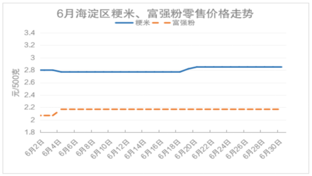 6月份,海淀区粳米月均价为2.8元/500克,环比5月份价格微幅上调0.72%。单日价格区间为2.77-2.85元/500克。月末较月初价格上涨1.79%。