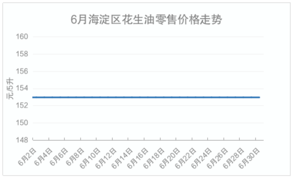 本月,海淀区花生油月均价为152.95元/5升,环比5月份下降0.58%。单日价格均为152.95元/5升。月初价格开于152.95元/5升,稳定运行至月底,月末较月初价格持平。