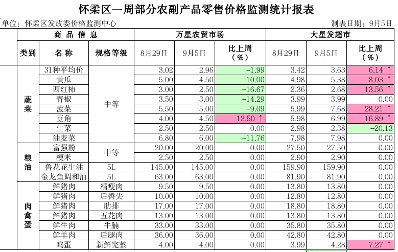 怀柔区发改委本周市场监测情况(8.29-9.5)