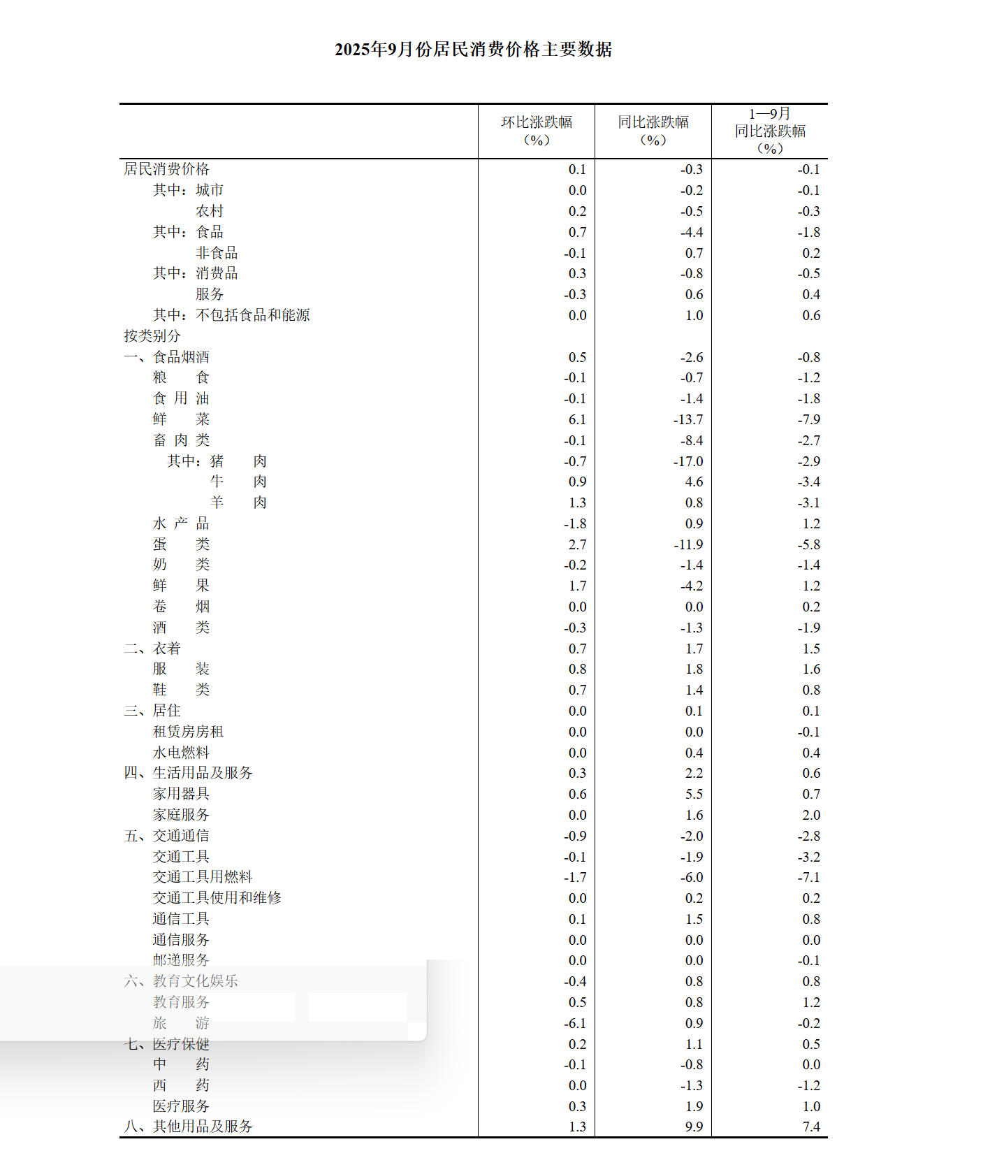9月份,全国居民消费价格环比上涨0.1%。其中,城市持平,农村上涨0.2%;食品价格上涨0.7%,非食品价格下降0.1%;消费品价格上涨0.3%,服务价格下降0.3%。