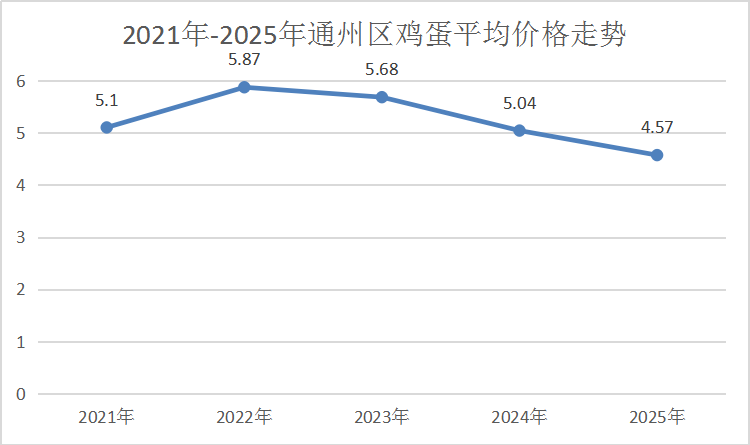 2021年到2025年以来,我区鸡蛋价格以降为主。2021年平均价格为5.10元/500克,2022年5.87元/500克,达到5年来最高,从2023年开始价格逐年回落,环比降幅分别为3.24%、11.27%和9.33%。