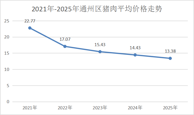 2021年到2025年我区猪肉平均价格逐年回落。2021年平均价格为22.77元/斤,为近五年最高,2022年至2025年呈逐年回落走势,同比降幅分别为25.03%、9.61%、6.48%和7.28%。