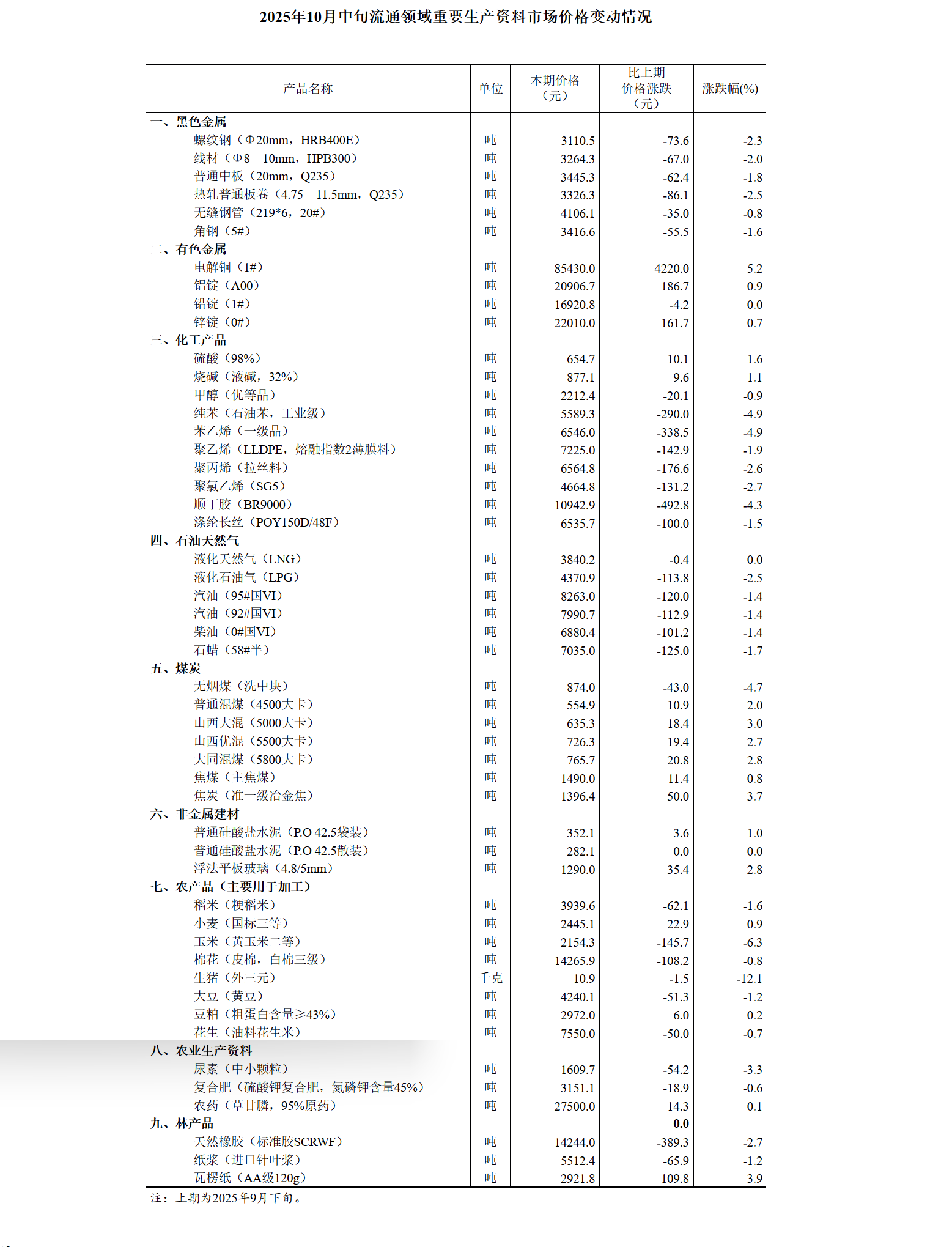 2025年10月中旬流通领域重要生产资料市场价格变动情况