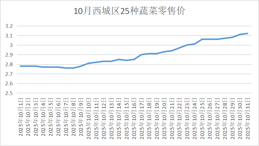 10月份,西城区25种蔬菜均价为2.9元/500g,环比上涨5.07%,同比下降23.68%,低于北京市平均价格水平3.24元/500g,整体均价呈现波动上升趋势。从具体品种看,25种蔬菜19涨6降,涨幅前三名为苦瓜、豆角、黄瓜,涨幅分别为27.11%、13.08%、12.5%;降幅前三名为大白菜、菠菜、圆白菜,降幅分别为17.09%、5.88%、4.49%。