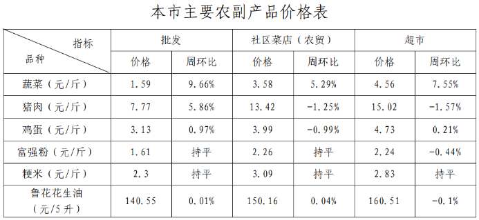 本周(10月25日-31日)蔬菜批发价格上涨至近三年高位运行,猪肉批发价格恢复性上涨。从全国价格水平看,北京市蔬菜、猪肉和鸡蛋零售均价在36个大中城市中,从高到低排名分别为第33、30和21位,均低于全国平均价格水平。1.受蔬菜供京主产区快速降温天气影响,批发价格上涨近一成,零售价格涨幅扩大。主产区快速降温天气和光照缺乏等因素,导致前茬蔬菜提前退市,但后茬蔬菜未顺利衔接,蔬菜批发价格继续上涨;由于往年10月秋季蔬菜价格多为季节性下行趋势,使得本周批发价格上涨已至近三年高位。25种蔬菜批发价格周环比22涨1平2降(涨幅前三的为:生菜81.82%、圆白菜50.51%、菜花38.67%)。批发、社区菜店、连锁超市价格分别为每斤1.59元、3.58元、4.56元,周环比涨幅分别为9.66%、5.29%、7.55%。2.猪肉批发价格恢复性上涨。本周猪粮比价为5.64:1,周环比上涨1.26%,仍处过度下跌三级预警区间。白条猪批发、精瘦肉农贸及超市价格分别为每斤7.77元、13.42元、15.02元,周环比涨幅分别为5.86%、-1.25%、-1.57%。3.鸡蛋价格微幅波动。鸡蛋批发、农贸、超市价格分别为每斤3.13元、3.99元、4.73元,周环比涨幅分别为0.97%、-0.99%、0.21%。4.粮油供应充足,价格基本稳定。