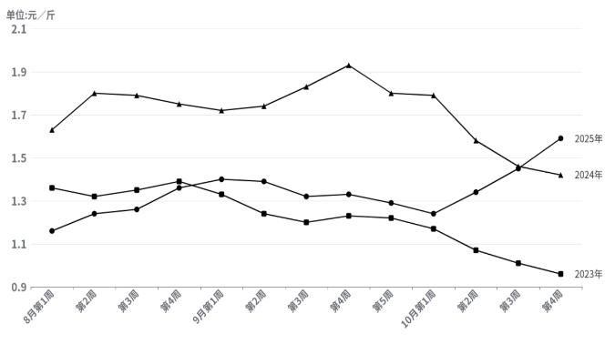 注: 2025年10月第四周蔬菜批发价格为每斤1.59元,周环比涨幅为9.66%,较2024年同比涨幅为11.97%,较2023年同比涨幅为65.63%。