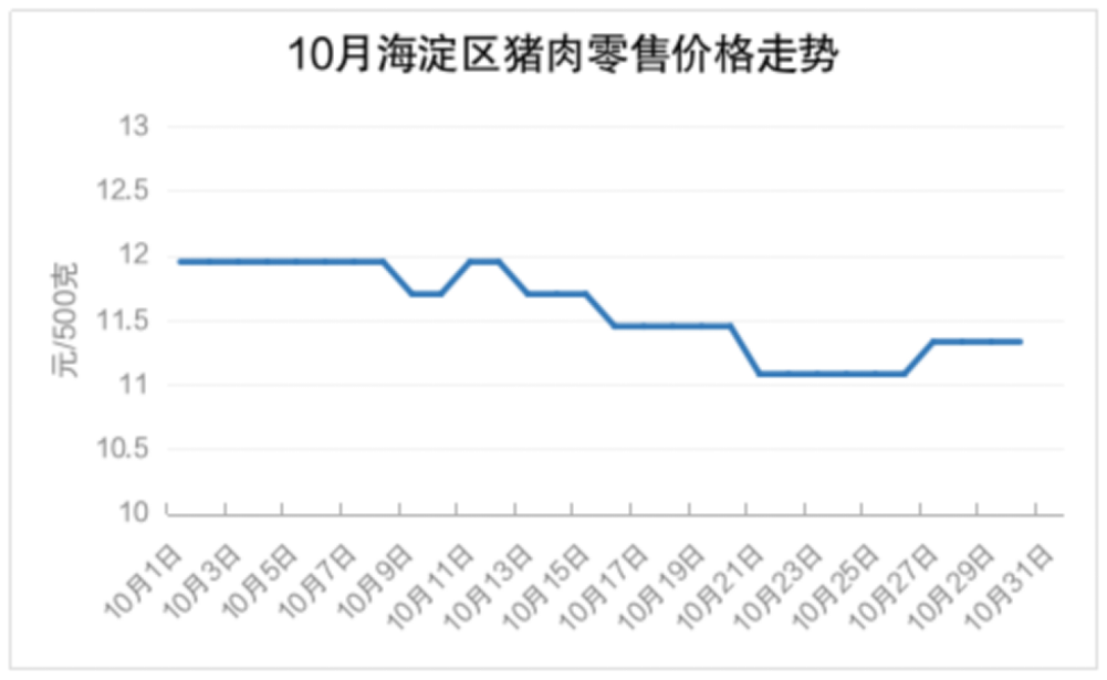 10月份,海淀区猪肉月均价为11.56元/500克,环比9月份下降1.95%。本月猪肉单日价格区间为11.08-11.95元/500克,整体价格呈波动下行趋势。月初价格开于本月最高价11.95元/500克,稳定运行8日后,至9日价格降至11.7元/500克,11日价格回弹至11.95元/500克,13日价格再次降至11.7元/500克,运行3日后,至16日价格降至11.45元/500克,运行至20日,21日价格再次下降至本月最低价11.08元/500克,稳定运行6日后,27日价格涨至11.33元/500克,保持至月底。月底较月初价格上下降5.19%。