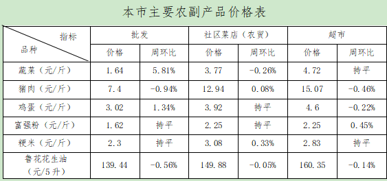 本周(11月22日-28日)除蔬菜和鸡蛋批发价格上涨外,其他各类生活必需品价格基本稳定