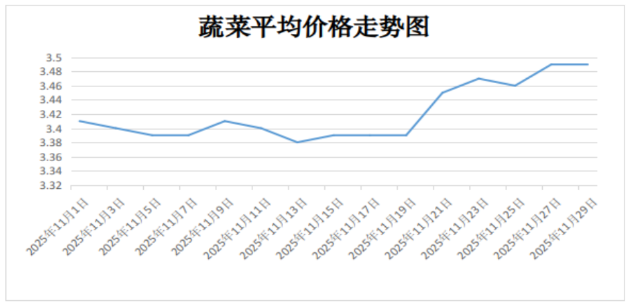 11月蔬菜零售价格整体上涨。主要原因:一是供应端部分品类因产地集中上市,价格震荡下降。二是进入冬季雨雪天气市场叶类菜需求增加,促使价格上涨。三是受季节因素影响11月为蔬菜换季期,部分品类(如苦菊、香菜、生菜)因供应减少,价格波动明显 。