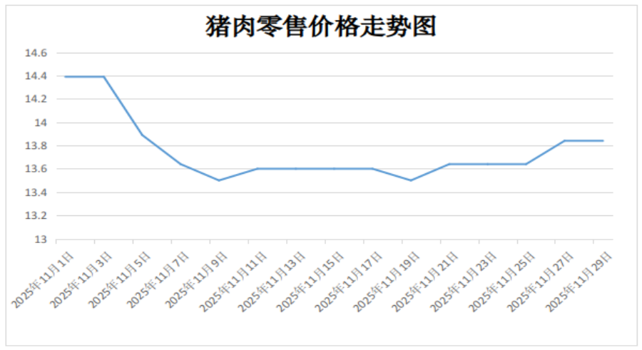 11月猪肉价格整体呈波动下行趋势。主要原因:一是供应充足。前期猪价上涨促使养殖户集中出栏,市场供应宽松,集团猪企增量出栏进一步加剧供应压力。二是需求疲软。气温回升叠加缺乏节日拉动,终端消费疲软,屠宰企业开工率下降,白条猪销售不畅。预计12月份市场猪肉价格将呈现稳中有降趋势,月内价格波动幅度较11月收窄,但整体仍处于下行通道。