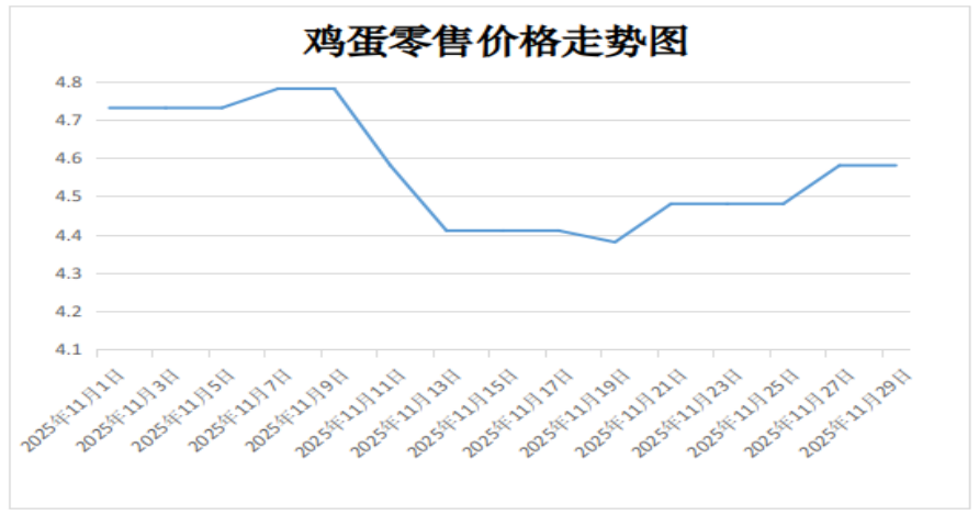 11月鸡蛋价格呈先跌后稳走势。主要原因:一是供需失衡。受8月鸡苗补栏下降影响,新开产蛋鸡减少明显,随着老鸡淘汰期加快,产蛋鸡存栏逐步下降。二是需求回暖。气温降低改善储存条件,加上商超促销带动需求逐步回暖。预计短期内仍受供应充足和需求平淡影响,鸡蛋价格维持底部运行可能性较大。