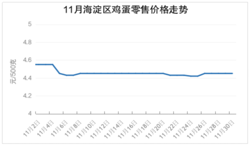 11月份,海淀区鸡蛋月均价为4.46元/500克,环比10月份下降4.29%。本月鸡蛋单日价格区间为4.42-4.55元/500克,整体价格呈下降趋势。月初价格开于本月最高价4.55元/500克,稳定运行至5日,6日微调至4.53元/500克,8日回弹至4.45元/500克,运行至20日,21日起价格持续微幅下降,24日降至本月最低价至4.42元/500克,26日价格再次回弹至4.45元/500克,稳定运行至月底。月底较月初价格下降2.2%。