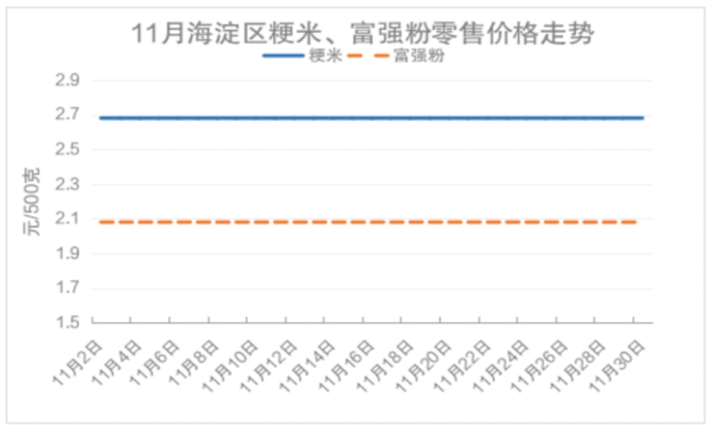 本月,海淀区富强粉月均价为2.08元/500克,环比10月份价格下降2.35%。单日价格为2.08元/500克。整体价格保持稳定。