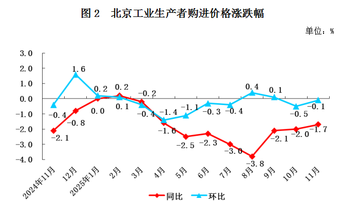 11月份,北京工业生产者出厂价格同比下降1.3%、环比下降0.2%;工业生产者购进价格同比下降1.7%、环比下降0.1%。