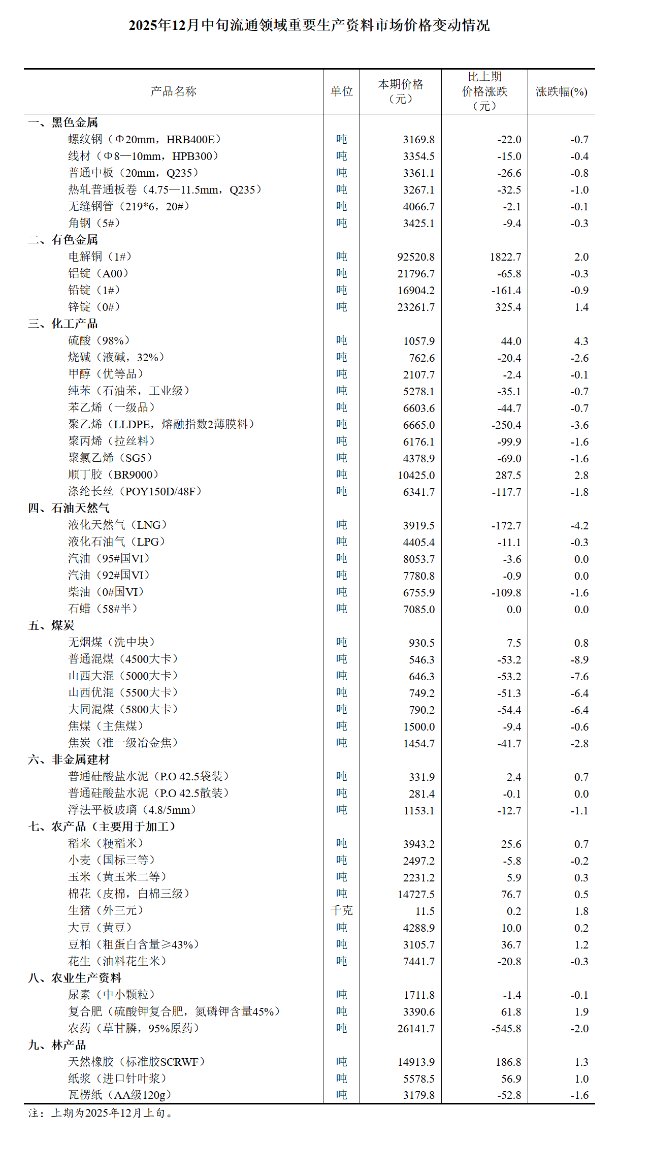 2025年12月中旬流通领域重要生产资料市场价格变动情况
