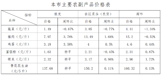 本周(1月3日-9日)蔬菜价格稳中有降,猪肉和鸡蛋批发价格上涨,粳米零售价格小幅上涨。从全国价格水平看,北京市蔬菜、猪肉和鸡蛋零售均价在36个大中城市中,从高到低排名分别为第32、23和21位,均低于全国平均价格水平。1.冬季运营模式下,蔬菜价格微幅下降。近期蔬菜供应充足,价格逐步下行。6家批发市场蔬菜日均上市量2.68万吨,周环比增加1.13%。25种蔬菜9涨1平15降(涨幅前三的为:小白菜21.72%、黄瓜10.62%、芹菜4.67%)。蔬菜批发、社区菜店、连锁超市价格分别为每斤1.49元、3.85元、4.41元,周环比涨幅分别为-0.67%、-0.77%、-1.34%。2.猪肉批发价格连续四周上涨。本周猪粮比价为5.62:1,周环比上涨3.88%。白条猪批发、精瘦肉农贸及超市价格分别为每斤7.97元、13.49元、15.2元,周环比涨幅分别为3.78%、1.66%、-0.52%。3.鸡蛋批发价格恢复性上涨。鸡蛋批发、农贸、超市价格分别为每斤3.18元、4元、4.6元,周环比涨幅分别为3.58%、0.5%、0.44%。4.粳米零售价格小幅上涨,其它粮油供应充足,价格基本稳定。