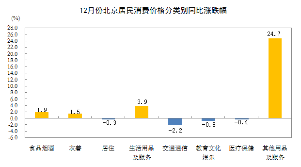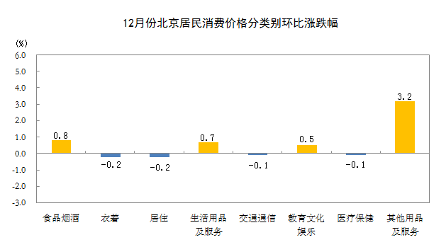 12月份,北京居民消费价格同比上涨1.0%。其中,食品价格上涨3.1%,非食品价格上涨0.7%;消费品价格上涨2.1%,服务价格下降0.1%。