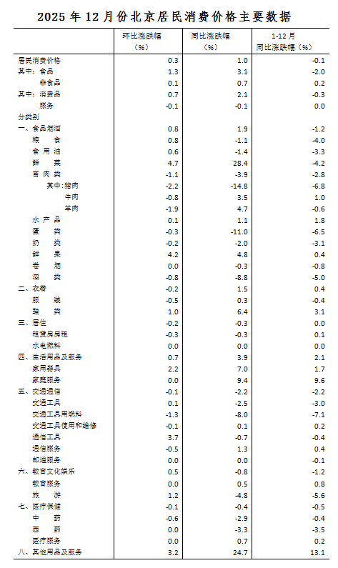 2025年12月份,北京居民消费价格环比上涨0.3%。其中,食品价格上涨1.3%,非食品价格上涨0.1%;消费品价格上涨0.7%,服务价格下降0.1%。