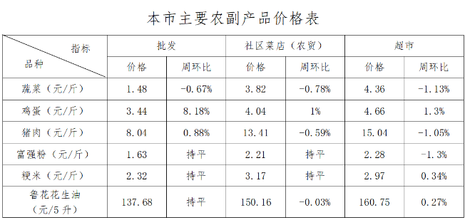 本周(1月10日-16日)鸡蛋批发价格低位上涨带动零售价格小幅上行,蔬菜和猪肉价格微幅波动