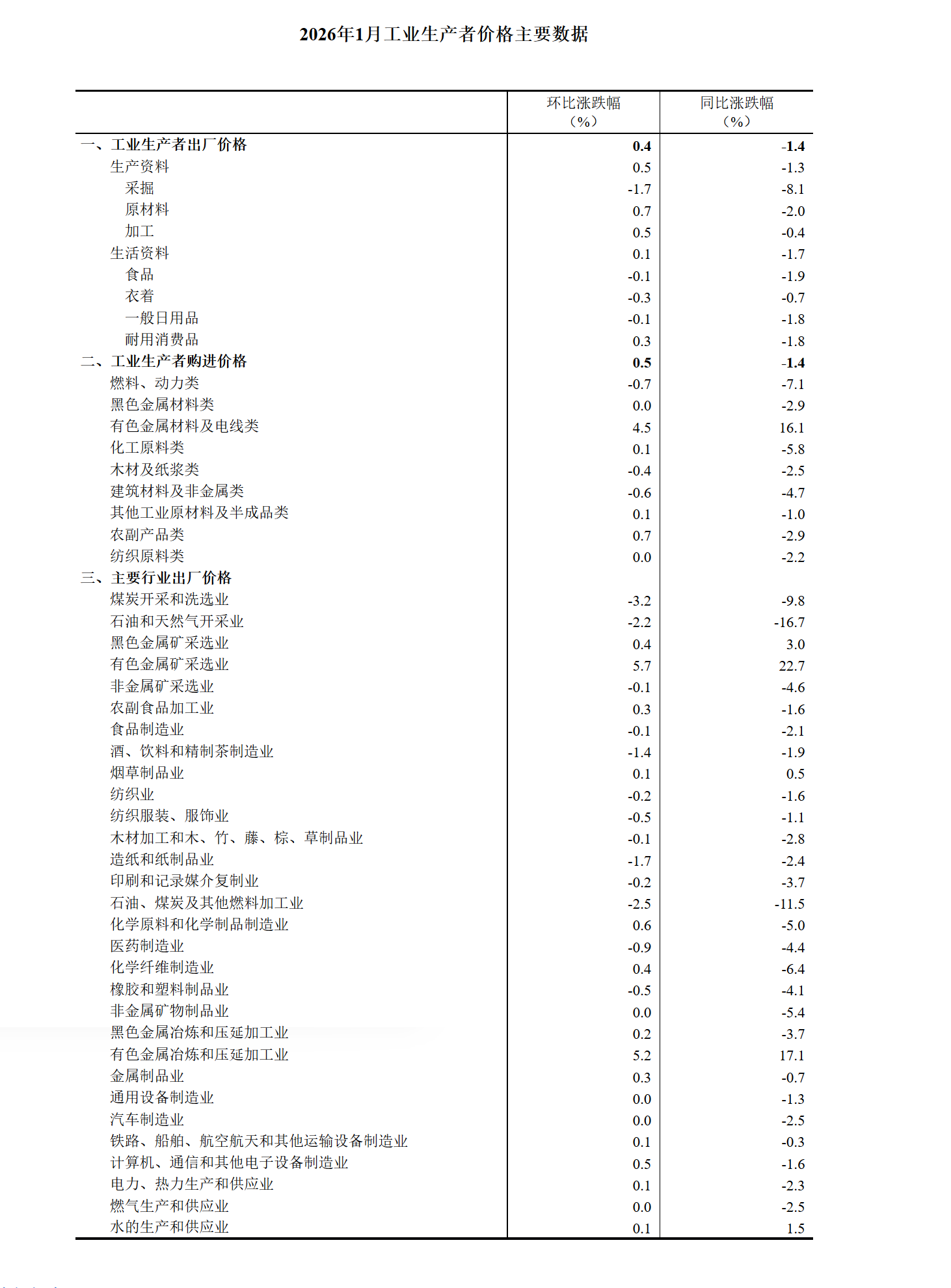 2026年1月份,全国工业生产者出厂价格同比下降1.4%,降幅比上月收窄0.5个百分点;环比上涨0.4%,涨幅比上月扩大0.2个百分点。工业生产者购进价格同比下降1.4%,降幅比上月收窄0.7个百分点;环比上涨0.5%,涨幅比上月扩大0.1个百分点。