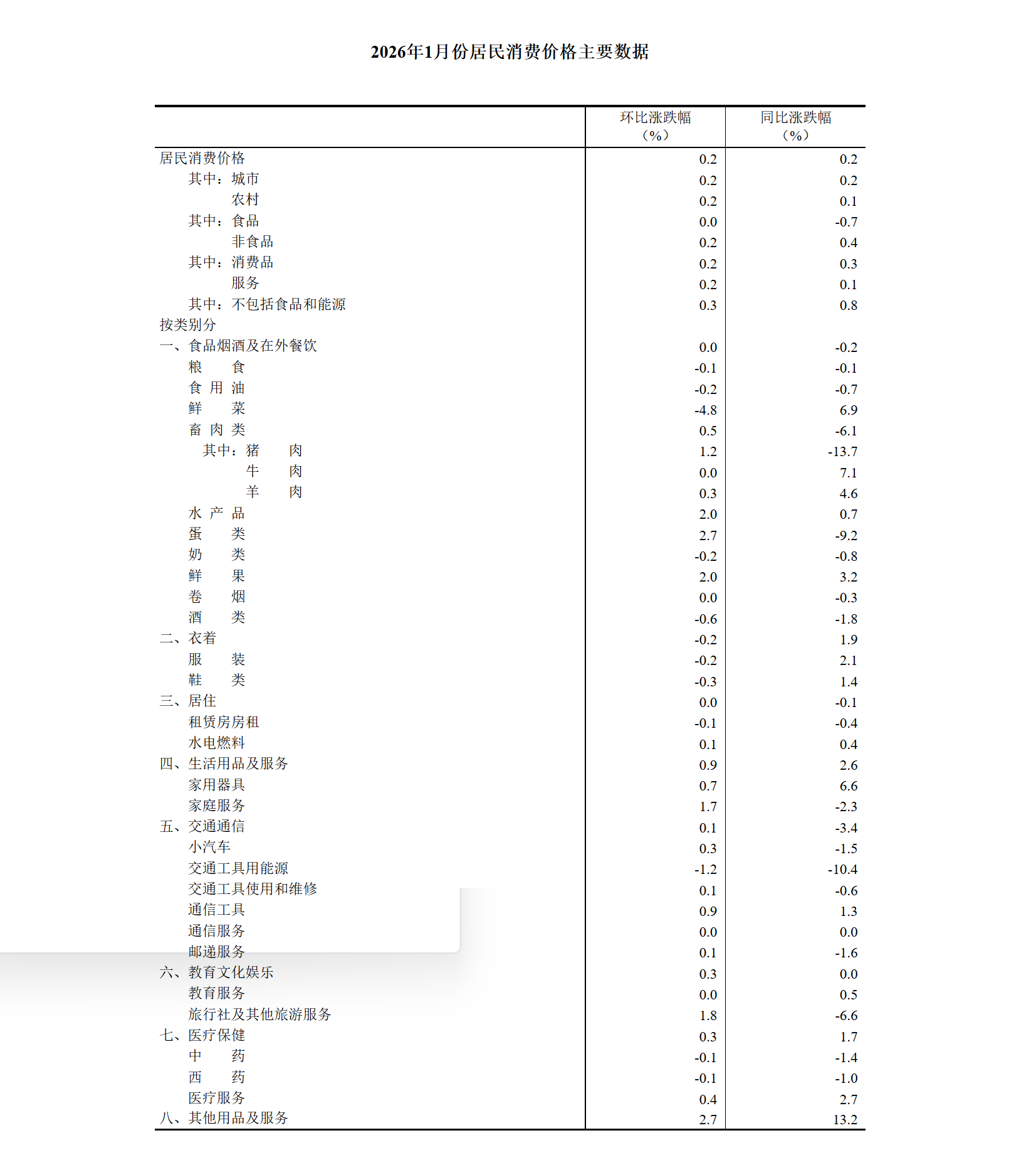 2026年1月份,全国居民消费价格同比上涨0.2%。其中,城市上涨0.2%,农村上涨0.1%;食品价格下降0.7%,非食品价格上涨0.4%;消费品价格上涨0.3%,服务价格上涨0.1%。