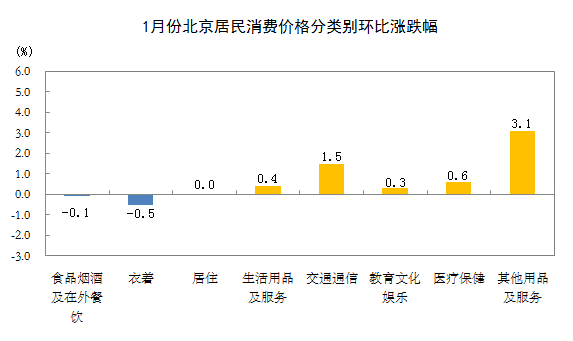 1月份,北京居民消费价格同比上涨0.1%。其中,食品价格上涨0.4%,非食品价格上涨0.1%;消费品价格上涨0.8%,服务价格下降0.3%。