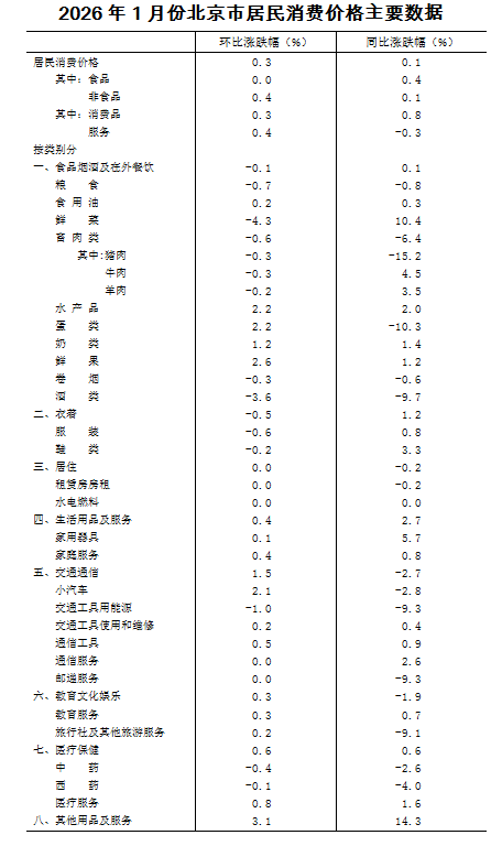 2026年1月份,北京居民消费价格环比上涨0.3%。其中,食品价格持平,非食品价格上涨0.4%;消费品价格上涨0.3%,服务价格上涨0.4%。