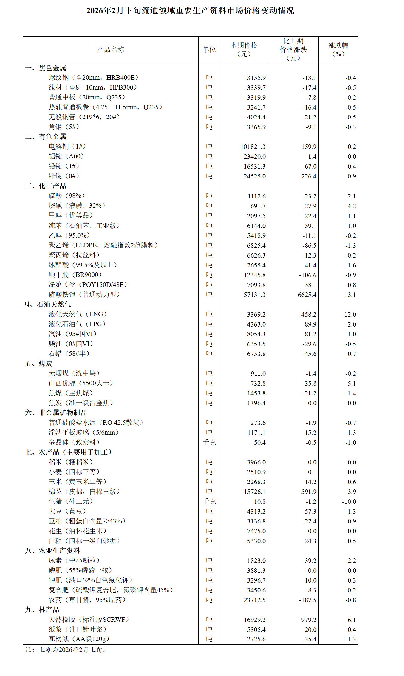 2026年2月下旬流通领域重要生产资料市场价格变动情况