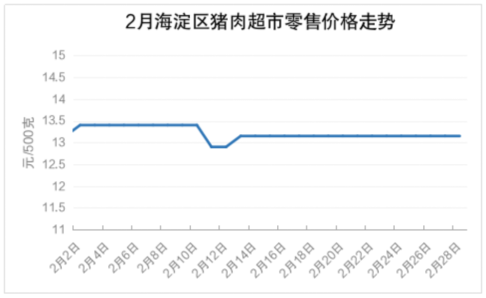 2月份,海淀区猪肉超市零售月均价为13.21元/500克,环比1月份下降8.01%。本月猪肉单日价格区间为12.9-13.4元/500克,整体价格波动调整。月初价格开于13.15元/500克,2日上涨至本月最高价13.4元/500克,持续运行9日后,下降至本月最低价12.9元/500克,13日小幅反弹至13.15元/500克,保持至月底。月底较月初价格持平。