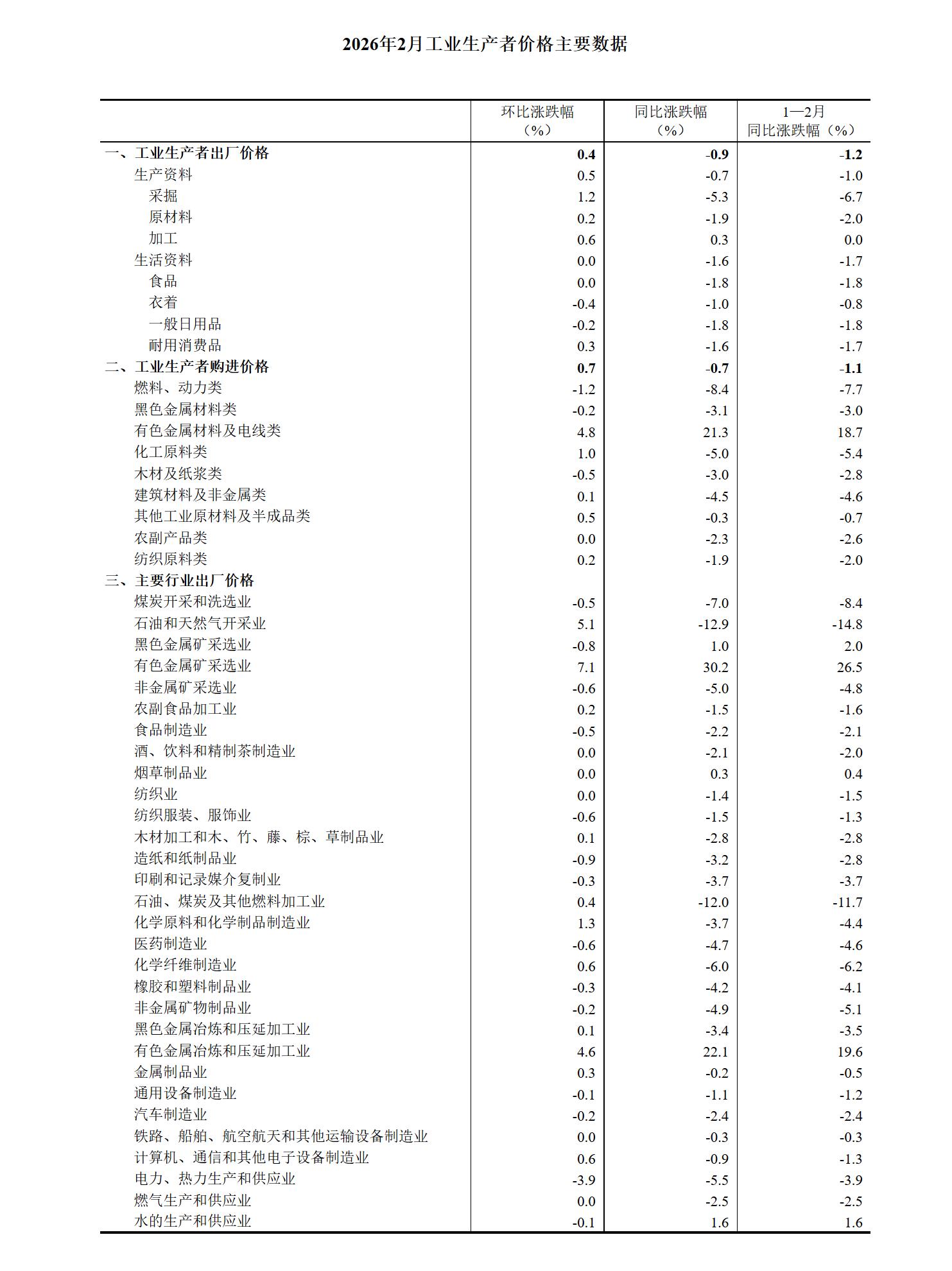 2026年2月份,全国工业生产者出厂价格同比下降0.9%,降幅比上月收窄0.5个百分点;环比上涨0.4%,涨幅与上月相同。工业生产者购进价格同比下降0.7%,降幅比上月收窄0.7个百分点;环比上涨0.7%,涨幅比上月扩大0.2个百分点。1—2月平均,工业生产者出厂价格比上年同期下降1.2%,工业生产者购进价格下降1.1%。