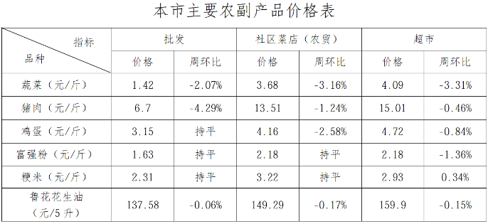 本周(3月7日-13日)全国“两会”闭幕,本市各类生活必需品价格整体稳中有降,处近三年中低位水平运行