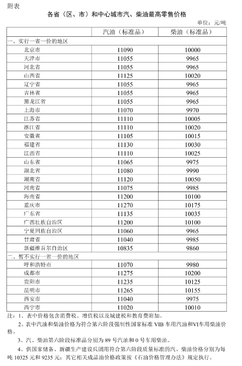 附:各省(区、市)和中心城市汽、柴油最高零售价格