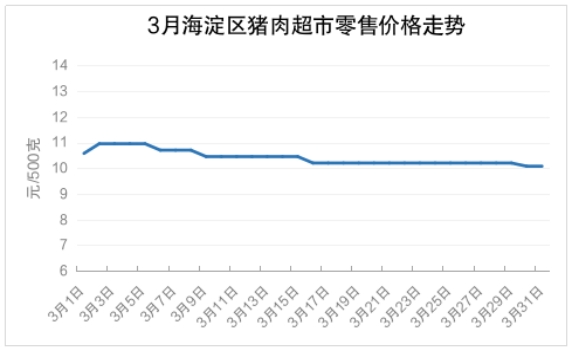 3月份,海淀区猪肉超市零售月均价为10.41元/500克,环比2月份下降3.2%。本月猪肉单日价格区间为10.08-10.95元/500克,整体价格波动下行。月初价格开于10.58元/500克,2日上涨至本月最高价10.95元/500克,保持四日后,持续小幅下降,6日价格为10.7元/500克,9日价格为10.45元/500克,16日价格为10.2元/500克,30日价格降至本月最低价10.08元/500克,保持至月底。月底较月初价格下降4.7%。