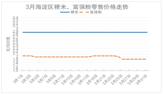 3月份,海淀区粳米零售月均价为2.87元/500克,环比2月份价格持平。整体价格保持稳定。