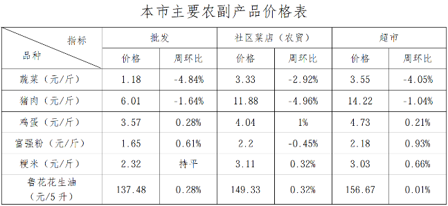 本周(4月4日-10日)蔬菜和猪肉价格继续下降,鸡蛋和粮油价格波动幅度均在1%以内