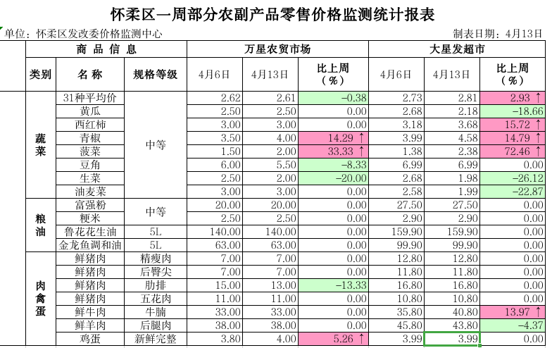 怀柔区发改委本周市场监测情况(4.6-4.13)