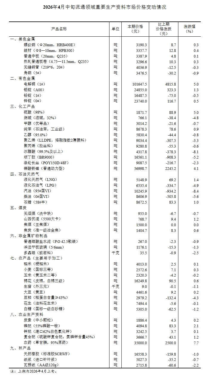 据对全国流通领域9大类50种重要生产资料市场价格的监测显示,2026年4月中旬与4月上旬相比,23种产品价格上涨,26种下降,1种持平。