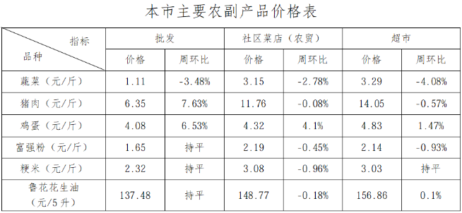 本周(4月18日-24日)猪肉批发价格连续下跌八周后止跌回升,鸡蛋价格继续上涨,蔬菜价格保持季节性下降趋势。从全国价格水平看,北京市蔬菜、鸡蛋和猪肉零售均价在36个大中城市中,从高到低排名分别为第30、24和24位,均低于全国平均价格水平。1.蔬菜供应充足,批发价格保持九连降。25种蔬菜7涨2平16降(涨幅前三的为:白萝卜20.97%、西红柿10.34%、莴笋9.32%)。蔬菜批发、社区菜店、连锁超市价格分别为每斤1.11元、3.15元、3.29元。2.猪肉批发价格止跌回升。本周猪粮比价为4.18:1,周环比上升1.21%。随着国家及地方产能调控政策的密集出台,市场预期向好,批发价格结束连续八周下行趋势。白条猪批发、精瘦肉农贸及超市价格分别为每斤6.35元、11.76元、14.05元,周环比涨幅分别为7.63%、-0.08%、-0.57%。3.鸡蛋价格继续上涨,已至近三年高位。鸡蛋批发、农贸、超市价格分别为每斤4.08元、4.32元、4.83元,周环比涨幅分别为6.53%、4.1%、1.47%。4.粮油供应充足,价格基本稳定。